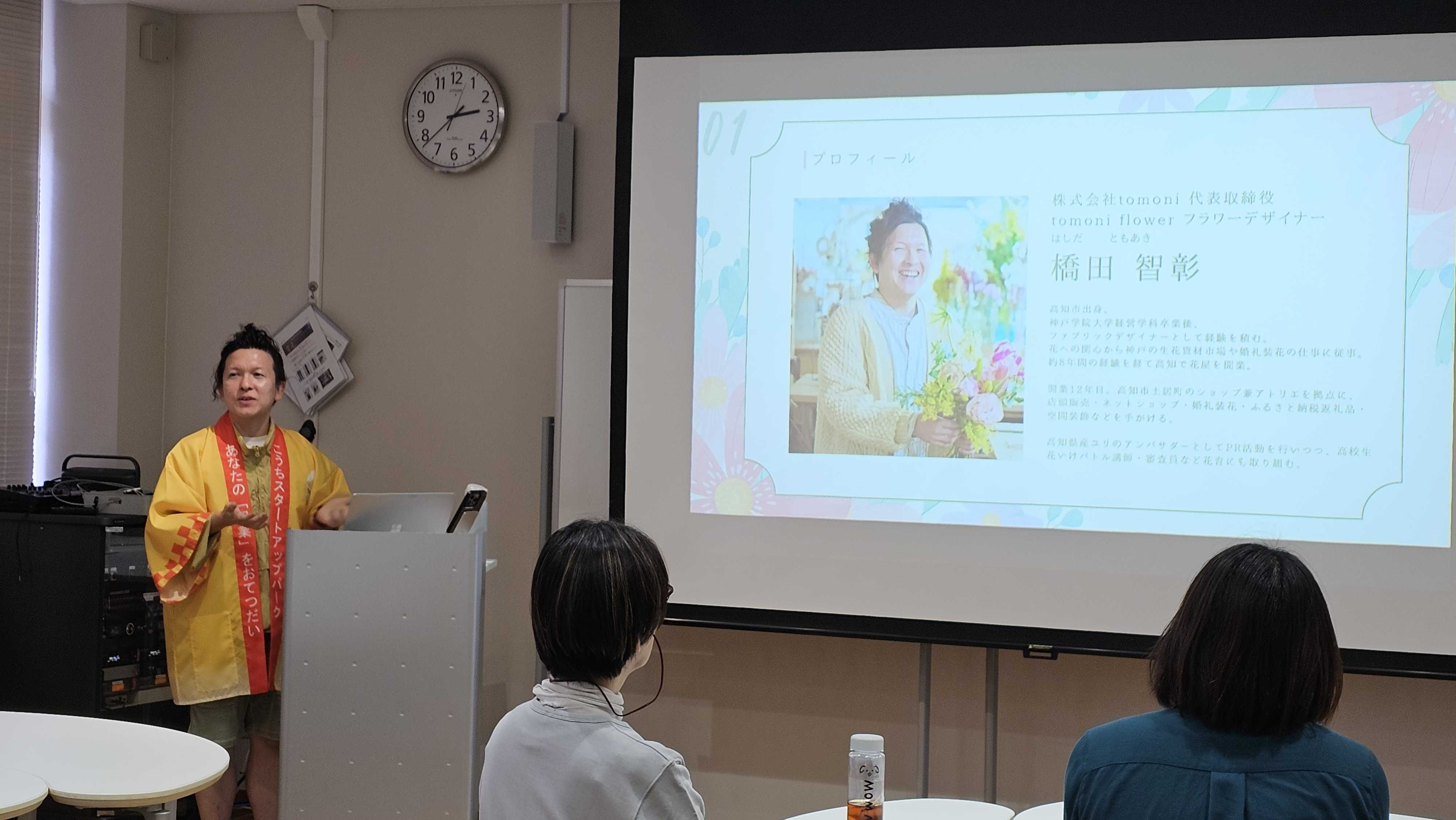また、株式会社tomoniの代表取締役である橋田智彰氏からは、ご自身が運営されているフラワーショップおよび空間デザイン事業についてお話しいただき、起業に至るまでのストーリーや、事業を続ける中で直面した難しさについて語っていただきました。地域の資源を活かしながら、自分らしい形でビジネスを育てていくリアルな経験談に、参加者も深く共感していました。